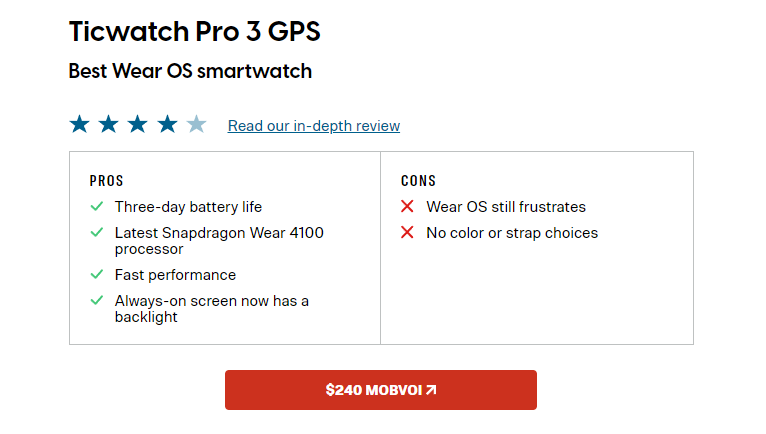 Why we picked the Mobvoi TicWatch Pro 3: The best smartwatch you can buy with Google’s Wear OS software at the moment is the [Mobvoi TicWatch Pro 3. It uses Qualcomm’s Snapdragon Wear 4100 processor, which is more powerful and more power-efficient than the Snapdragon Wear 3100 found in other Wear OS smartwatches. By getting the latest tech, your smartwatch will last you longer.