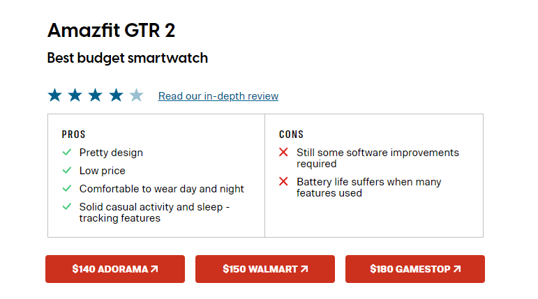 Why we picked the Amazfit GTR 2: Amazfit's hardware and software have matured a lot over the past year or so, to the point where we can happily recommend the Amazfit GTR 2 smartwatch, which has significant benefits over buying a cheap smartwatch with Google’s Wear OS software. The biggest is battery life, as the GTR 2 lasts at least a week even with heavy use, or even longer if you’re careful with the power-hungry features.